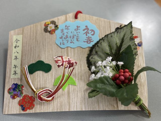 新年に向けて、手工芸クラブでは絵馬作りを行いました。木目調の台紙に、縁起の良い水引や松竹梅の飾り、南天のアレンジなどをあしらい、皆さん思い思いの願いを込めて丁寧に仕上げていました。それぞれの個性が光る、温かみのある絵馬が完成しました。新しい年が良い一年になりますように。