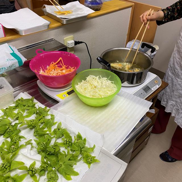 ケアハウスでは畑で採れたフキノトウ・人参・玉葱の天ぷらづくりを行っています。