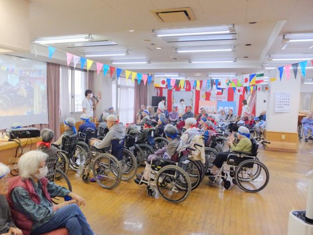 赤組・青組に分かれ運動会を行いました。種目は障害物競走・玉投げなど工夫を凝らした競技となりご利用者様に楽しんで頂きました。写真は開会式の場面になります。